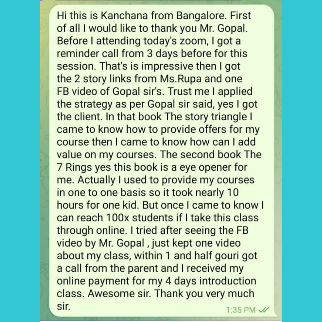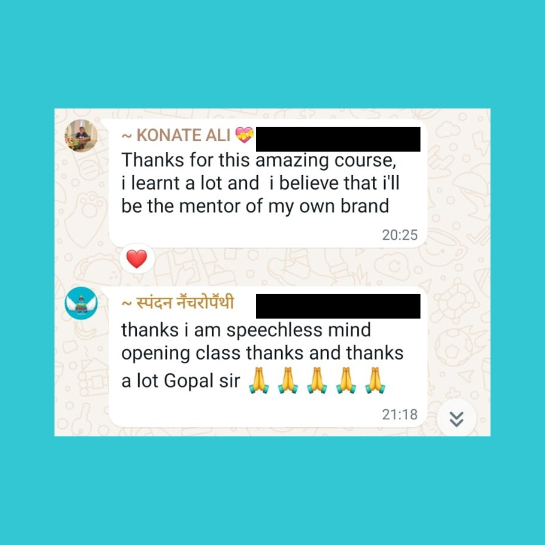 Over the past nine years, Gopal has been a mentor and practitioner-teacher for coaches seeking more leads, sales, and students in their communities. He has worked with over 150,000 coaches and consultants, with more than 200 of them scaling their businesses to ₹1 crore or more in revenue. Gopal paved way for the mini course marketing era on a global level with his Binge Marketing Method and WhatsApp Class model. With these phenomenal models he shows coaches how to build their leadership brands and scale their coaching business to seven figures and beyond.
