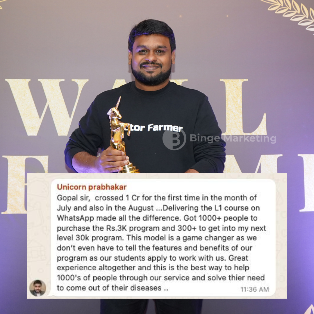 Gopal Krishnan is well known to the Indian audience as the creator of Binge Marketing Method and the Unicorn Awards for digital coaches. His recent offline summits - Binge Marketing Summit and Unicorn Coach Summit had made waves in the Indian coaching industry for the sheer impact & transformation it created in the lives of ordinary coaches. Gopal has also been a proud speaker at many prestigious events like Funnel Growth Summit, Success Gyan event etc.