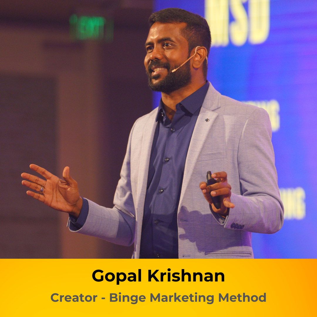 Over the past 7 years, Gopal has been the guide and practitioner-teacher for coaches who want more leads, more sales and more students in their community. Gopal has worked till now with over 25000 entrepreneurs who have implemented the Binge Marketing Model & experienced amazing results.